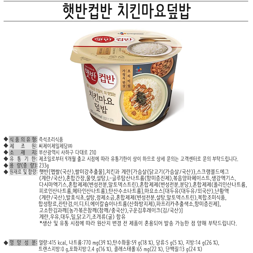 - HOME > 푸드 > 라면/면류/즉석식품/통조림 > 즉석식품 > CJ 치킨마요덮밥 232g x3개 [무료배송]